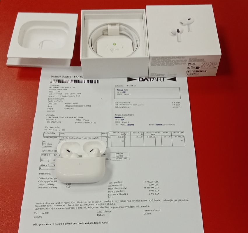 Apple AirPods Pro 2gen (2023) MTJVZM/A magsafe Usb-c použité - záruka do 6.8.2027 Datart. Krabička, datový kabel, náhradní špunty do uší. Oděrky na nabíjecím bílém pouzdru.