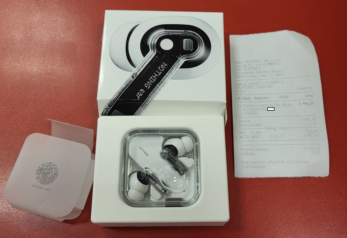 Nothing Ear rozbalené - krabička, nabíjecí pouzdro, kabel, náhradní špunty do uší. Záruka Mobilpohotovost do 30.9.2027
